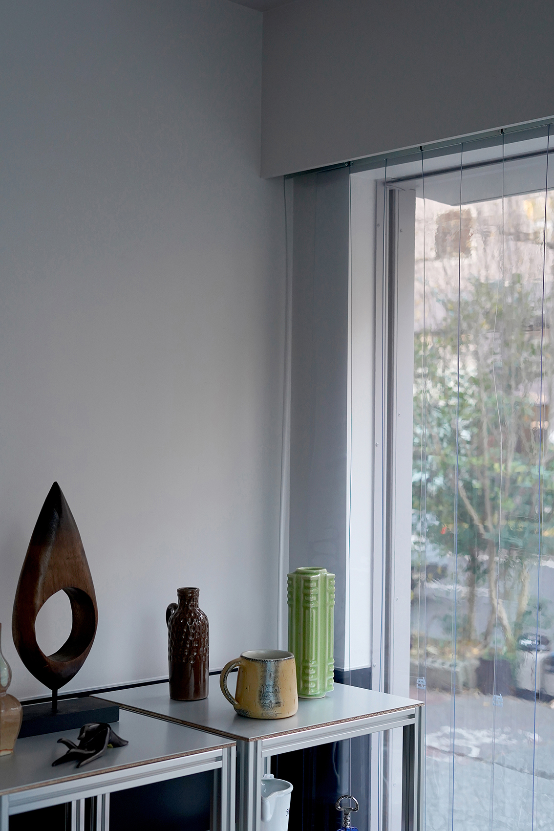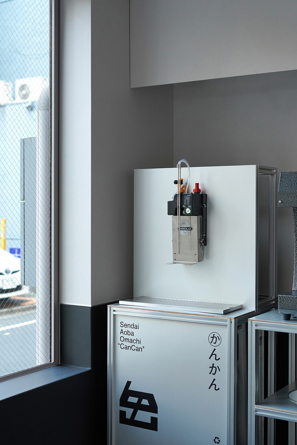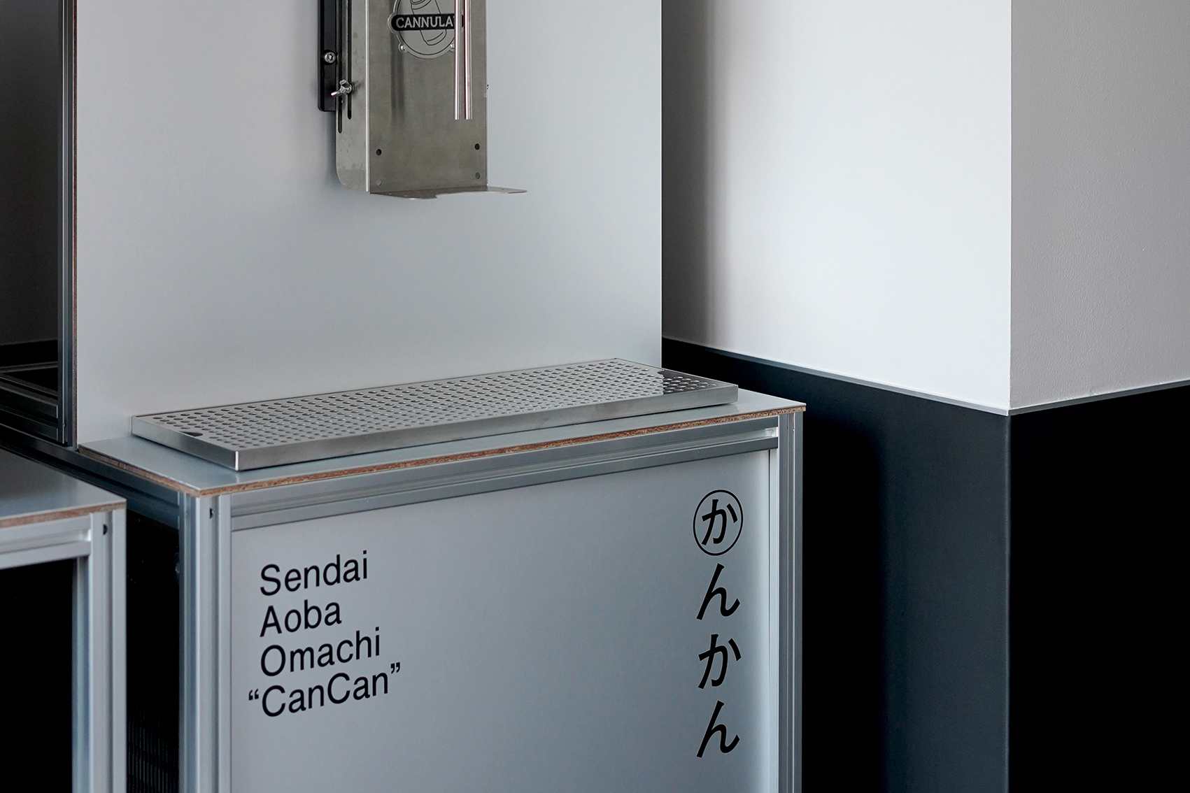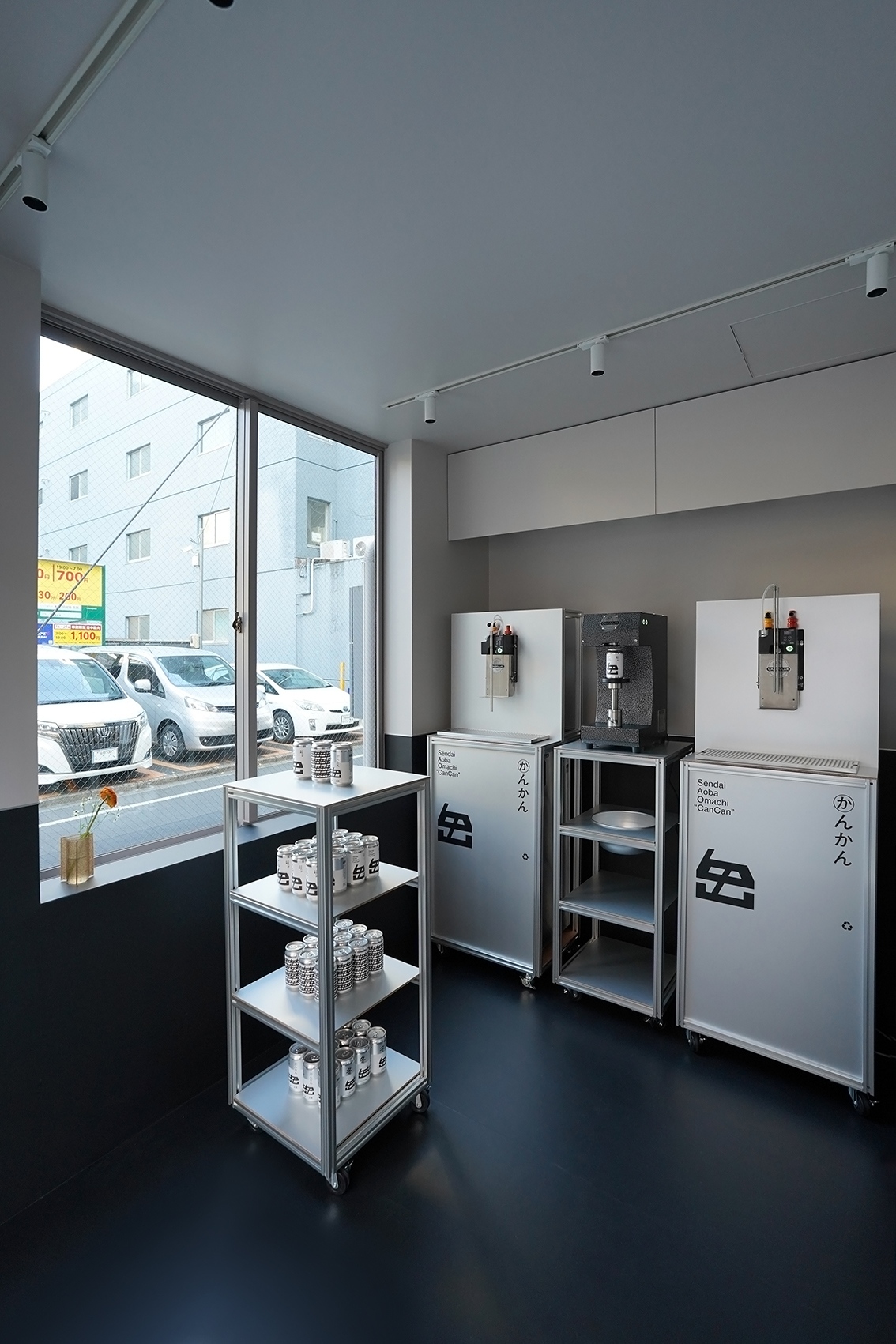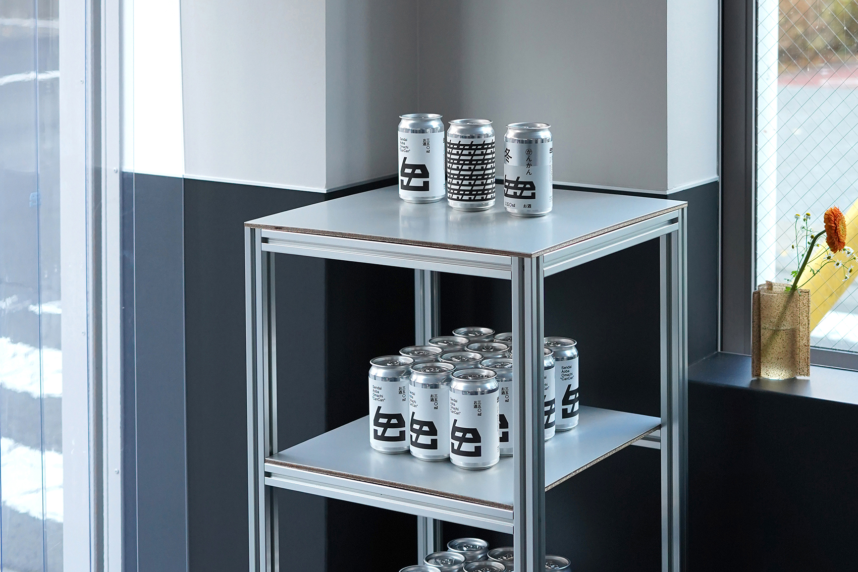 街角に面した、2.5坪の小さな店舗である。 クライアントからの依頼は、営業しているビールスタンドに隣接した2.5坪程度の区画に新たな業態として、オリジナルのクラフトビール缶で販売する店舗であった。また、ビールの販売だけでなく、缶のパッケージの開発、雑貨を缶を詰め込む作業の他、イベントへの出店や什器の貸し出しのように、缶にまつわる様々な実験や場所を変えて営業できる店舗づくりが求められた。 このプロジェクトでは小さな店舗であるからこそ、可動性や拡張性を事前に仕込んでおき、一般的な店舗という機能だけでなく、プロダクトの可能性を検証し続けるための実験室として、その作業性を設計している。 外観は隣接する姉妹店と一体感をつくりながら、出入口は透明な暖簾とすることで、光と視線が通り抜け、内部の様子がまちとの接点をもつ店構えとした。既存図面に記載されていた窓はこれまでのテナント工事によって塞がれていたため、窓を復活させ、多方向から見通しのきく当初の姿に戻した。 中に入ると、小さな空間に、缶と同素材の什器が高密度に配置され、光を反射するアルミの質感が空間全体に広がり、素材特有の軽さと冷たさが感じられる環境をつくり出す。什器は移動・分解・再構成が可能なユニット構造とすることで、様々な場所へと持ち出し、形を変えながら展開できる可搬性を確保した。什器の躯体は市販のアルミフレームをつかって構成、クライアント自らが解体と組立ができるディティールとし、部材の追加にもフレキシブルに対応できるようにした。 この小さな店舗そのものが、まちとつながり、まちを巡りながら、缶という小さなパッケージの可能性を試し続ける「缶の実験室」として機能することを目指している。